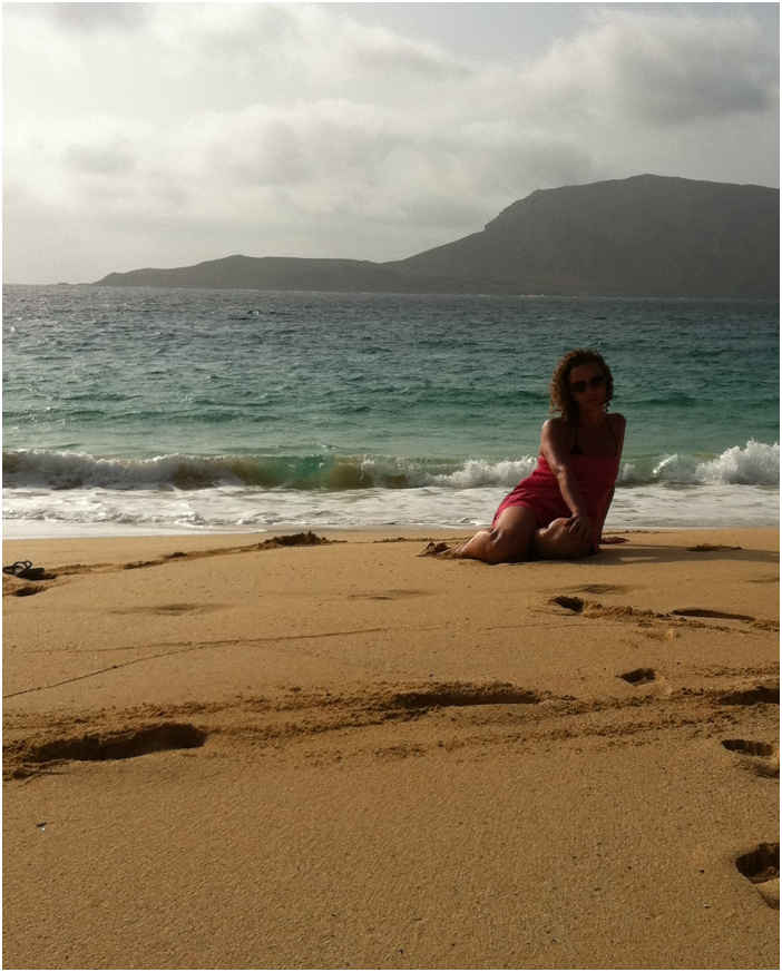 Recorrerla a pie con los niños no era buena idea, en bici era arriesgado por tramos cubiertos de arena de playa, y en un taxi Land Rover de 25 años de antigüedad nos pareció lo más apropiado. Nos llevó a playa Francesa, de agua clara y arena blanca, donde disfrutamos de un buen baño. A 15 minutos andando se encontraba cala Cocina, una playita recóndita a los pies de Montaña Amarilla, muy particular por su color amarillo ocre. Para acceder a la cala subimos una colina cubierta de guijarros y pedruscos puntiagudos que se clavaban como agujas en los pies descalzos de todos, excepto en los míos que calzaban chanclas. Eso me permitió cargar a Pablo al caballito. Casi al llegar, por una rampa imposible, se me rompió la del pie derecho. Me asombró Quela, que se afanó en llegar la primera sin quejarse. Me hizo muy feliz de nuevo ver a mis cuatro niños saltando juntos repetidamente en el agua. Cómo disfrutaron! La vuelta fue un continuo uy y ay pero mereció la pena. Yo cedí mi única chancla a Martein, que se rompió una uña contra una piedra.