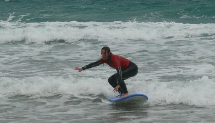 Por suerte me sirvió el primer traje que me probé, y después de los necesarios ejercicios de estiramientos con el numeroso grupo de adolescentes pasamos a la parte teórica, un par de nociones y al mar con la tabla.